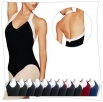 - Tank leotard. Adjustable gathers front. V neck body with halter line.