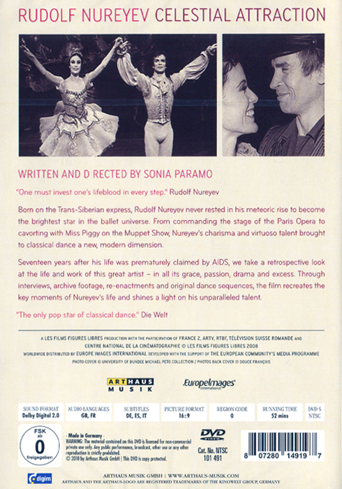 루돌프 누레예프(1938~1993)는 20세기 발레의 전설이다. 시베리아 대륙횡단열차에서 태어났으며 부친은 타타르 혈통의 레드 아미 정치장교였다. 우랄 산맥 기슭의 시골 우파에서 민속무용을 배우던 이 가난한 소년은 놀라운 재능으로 레닌그라드의 바가노바 발레학교에 입학할 수 있었으며, 출발이 늦었음에도 불구하고 가장 뛰어난 실력을 발휘하여 학교를 마치고 키로프 발레에 입학하자마자 당대 최고의 스타 나탈리아 두딘스카야의 파트너가 되었다. 그러나 틀에 얽매이지 않는 분방한 성격으로 극장 고위층과 갈등을 일으키다가 1961년 파리 공연 도중에 서구로 망명한다. 이후 누레에프는 로열 발레를 위시한 전세계 발레단에서 발레리노의 새로운 가능성을 과시한 것은 물론 철의 장막에 가려있었던 러시아 정통발레를 서구에 소개하는데도 일등 공신이 되었다. 이 영상물은 독특한 외모, 놀라운 속도감, 표범처럼 정교하고 우아한 움직임을 자랑하여 온갖 찬사의 대상이었으며, 안무가로서도 특히 파리 오페라 발레에 잊을 수 없는 족적을 남긴 누레예프의 불꽃 튀는 삶을 그가 에이즈로 죽은 지 17년 만에 다시 돌아본다. 이전의 다큐에 수록되지 않았던 희귀자료는 물론 그의 자취를 다시 찾아간 새로운 영상이 다수 포함되어 있다.