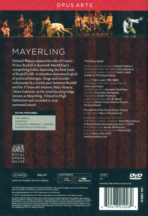 예술을 창조하는 동력으로 가장 중요한 양대 요소가 에로스(Eros)와 타나토스(Thanatos)다. 에로스는 광의의 의미로 삶에 활력을 불어넣는 힘이며 협의로는 성적인 매혹을 가리킨다. 반면 타나토스는 죽음에 대한 동경이다. 양자는 서로 대립되는 의미이면서도 예술가들을 가장 매혹시키는 주제인 것이다. 또 이 정반대의 의미가 결합하면 가장 폭발적인 정서적 분출을 일으키게 된다. 발레에 있어서 그 대표적 작품이 케네스 맥밀란의 '마이얼링'이다. '마이얼링'은 구체적 내용을 묘사하는 드라마 발레다. 1889년 1월 오스트리아의 궁정 사냥터 마이얼링에서 실제 벌어진 사건으로, 유전적 정신질환에 시달리던 합스부르크 왕가의 황태자 루돌프(당시 31세)는 정신적 압박을 견디지 못하고 17세의 소녀 마리 베체라와 권총 자살하고 말았다. 에로스에 탐닉하던 방종한 황태자가 스스로 생을 마감하는 과정이 숨 막히는 박진감으로 그려진다. 로열 발레의 무용수들이 가장 추고 싶어 하는 문제작이지만 1994년 이후 새 자료가 없었던 이 발레의 15년 만의 영상물이다. 에드워드 왓슨이 루돌프의 실제 모습과 무척 닮은 캐릭터를 창조했으며, 이탈리아 출신의 마라 갈레아치가 대범한 소녀 마리 베체라를 열연한다.