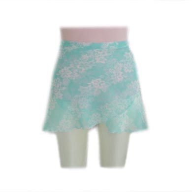 연한 옥색 바탕에 흰색 꽃이 나염된 쉬폰치마입니다~